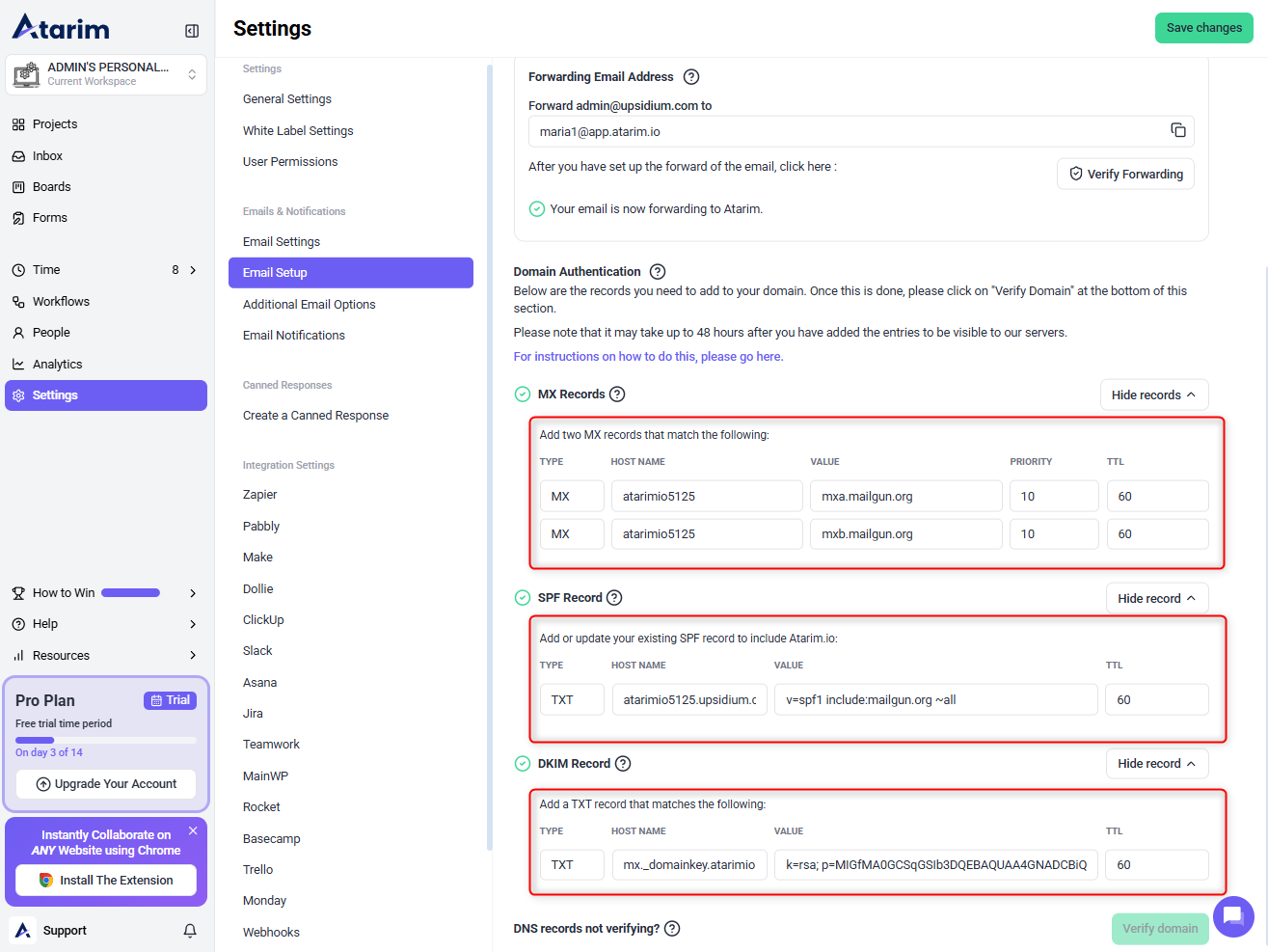 To ensure smooth email communication through app.atarim.io, you need to verify your domain by adding DNS records. This authentication process improves email deliverability, prevents spoofing, and allows you to customize your tracked links.