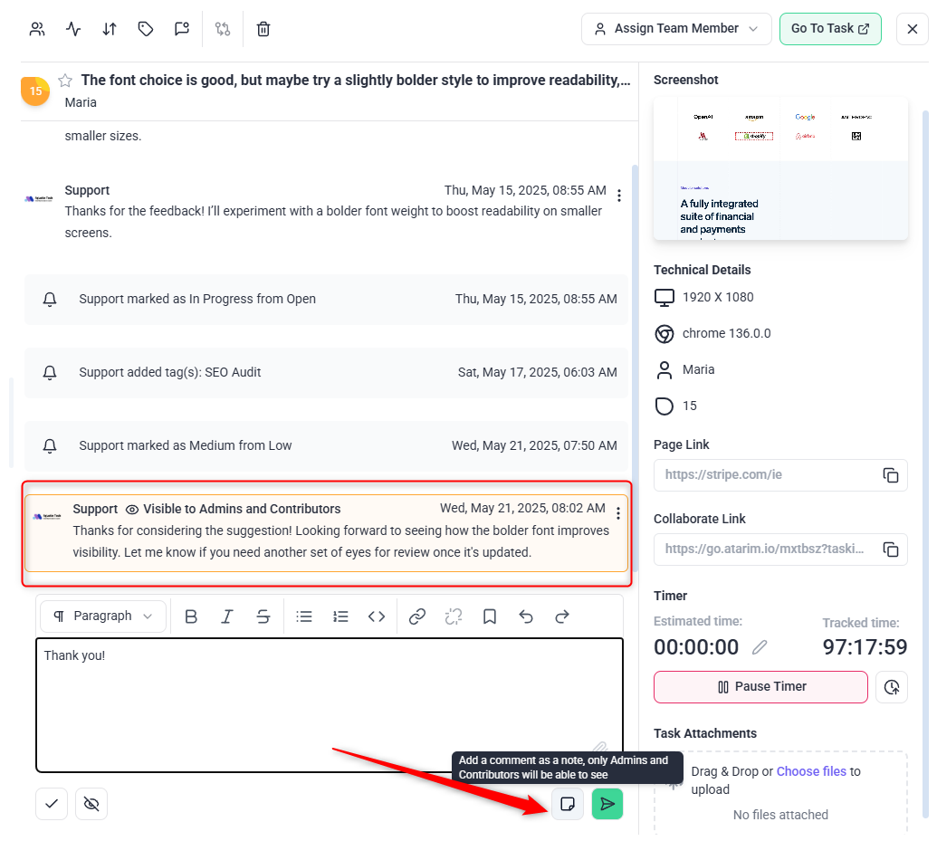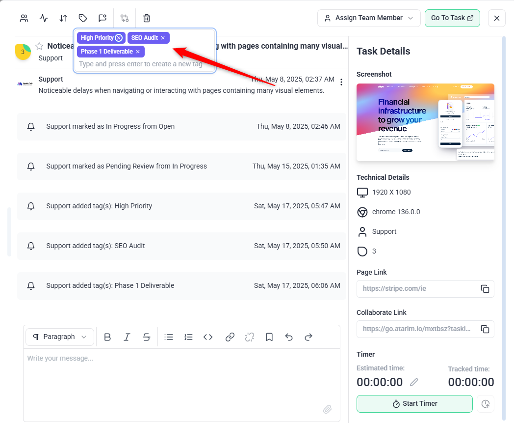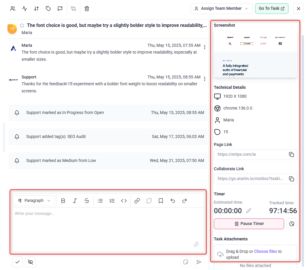 - Technical Details: Displays browser, OS, screen size, and task creator.