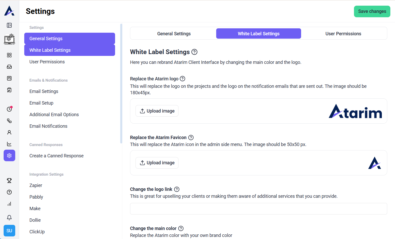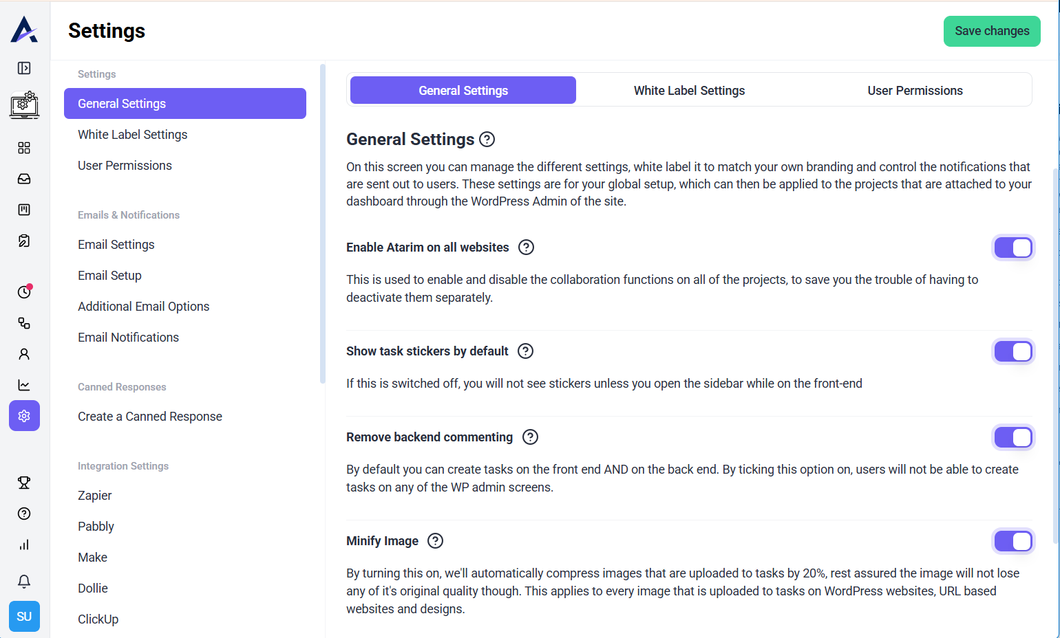 The Settings tab lets you configure settings that affect how Atarim interacts with all projects. You can manage general settings, use white label options to customize the interface, and set user permissions.