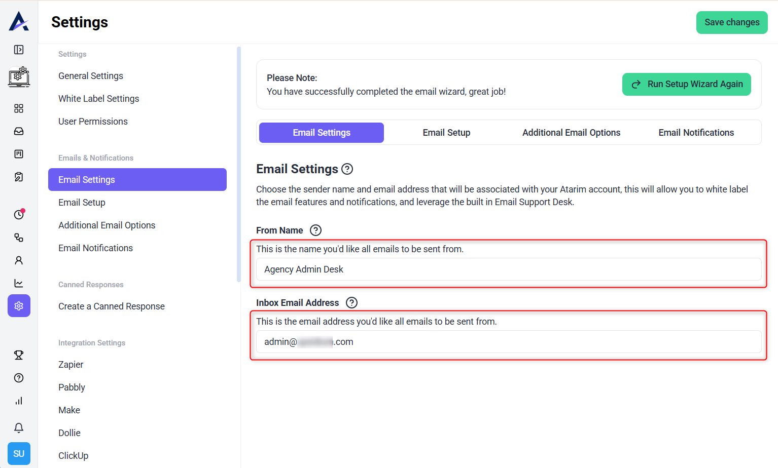 The Emails & Notifications tab allows you to configure your email inbox, set up email forwarding, and customize notifications for project updates, team activity, and task status changes. This ensures that key team members receive timely alerts, helping you stay informed without overwhelming your inbox. You can also white label your email communications by customizing the sender name and email address, and leverage Atarim’s built-in Email Support Desk to streamline all email-based communications with your clients.