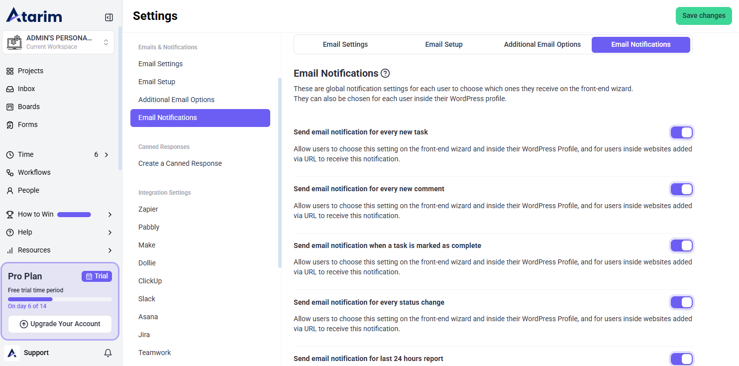 Learn how to configure and manage your account settings, email forwarding, canned responses, workspace settings, integrations, and notifications in Atarim to optimize your project management experience.
