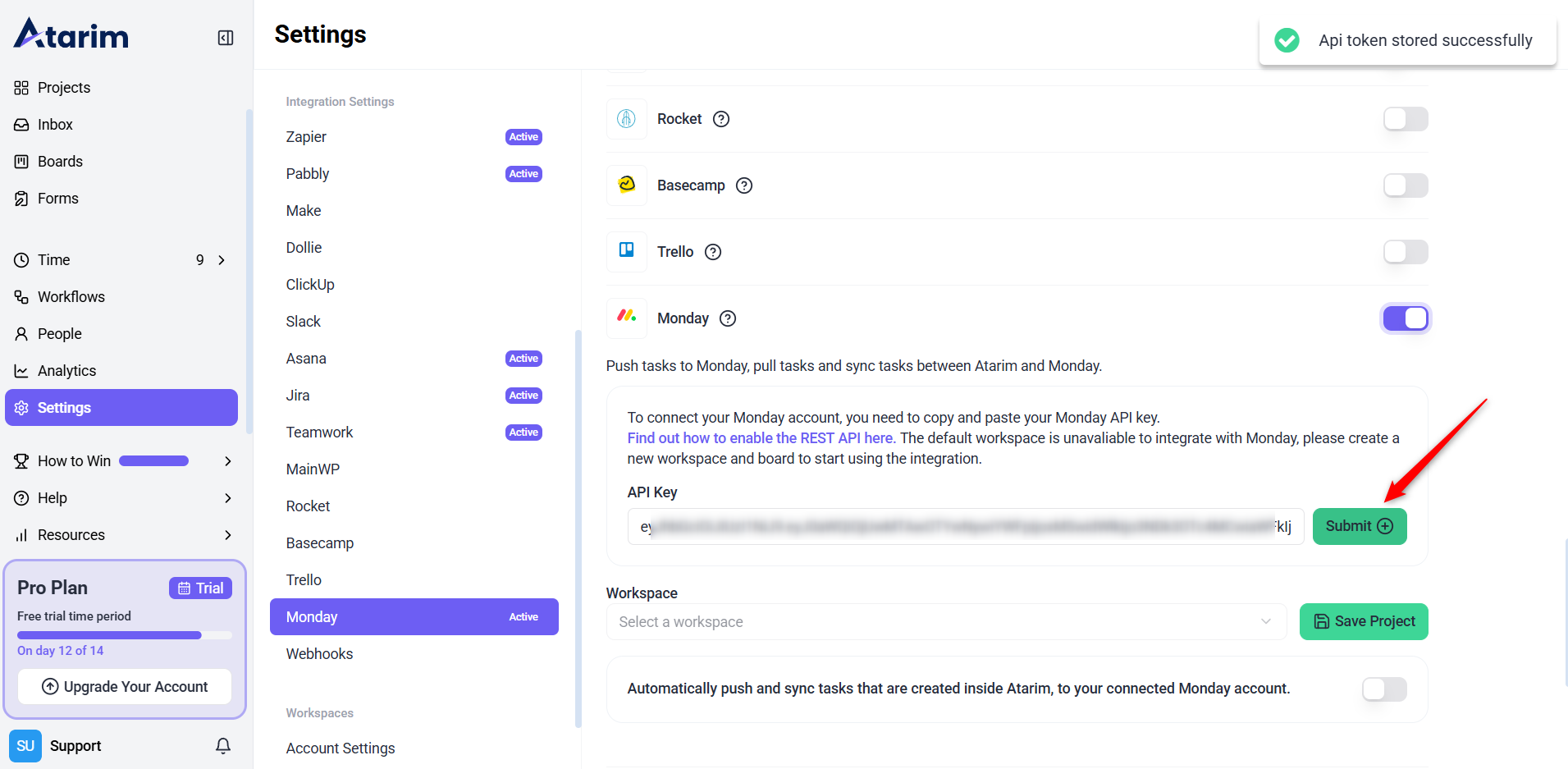 Finalize the integration by entering your Monday API key into Atarim.