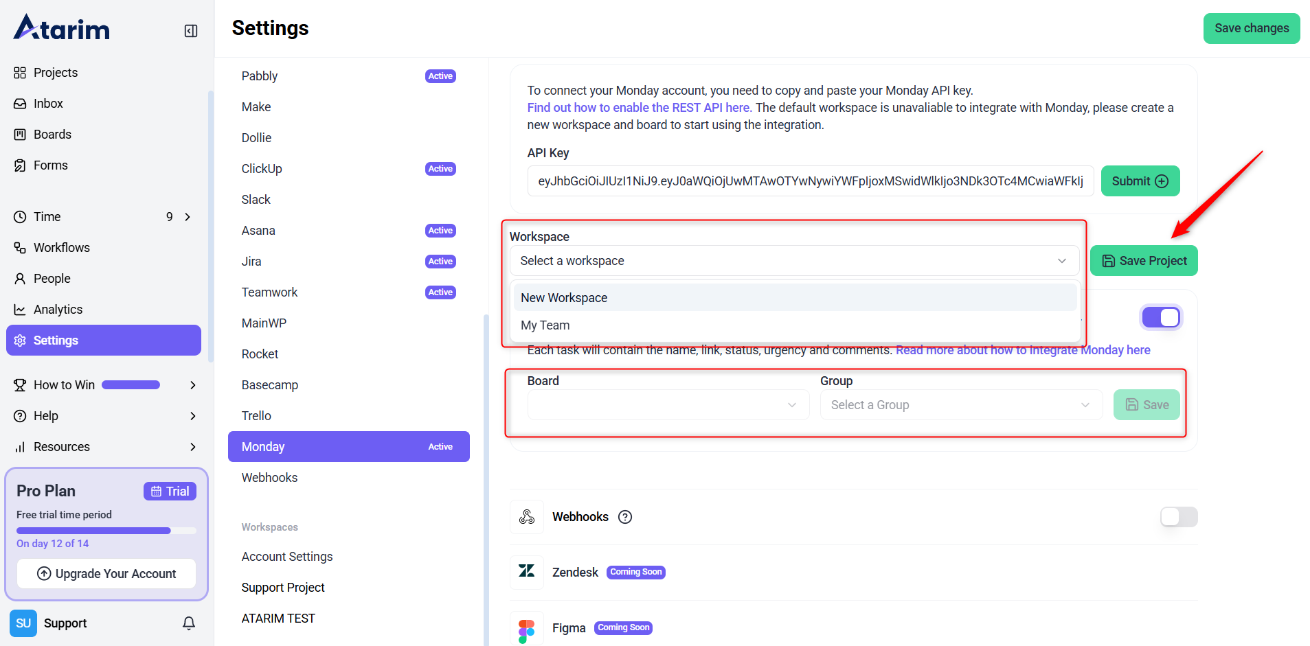 - Return to the Monday integration section in Atarim.