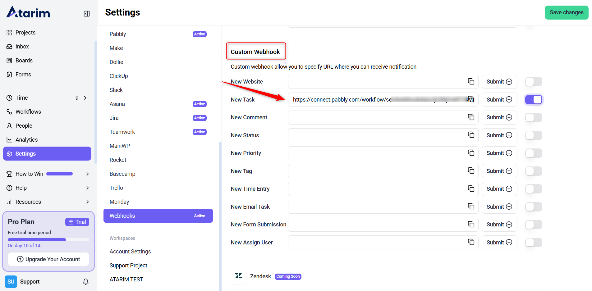 - Go back to Atarim’s Settings – Webhooks section.