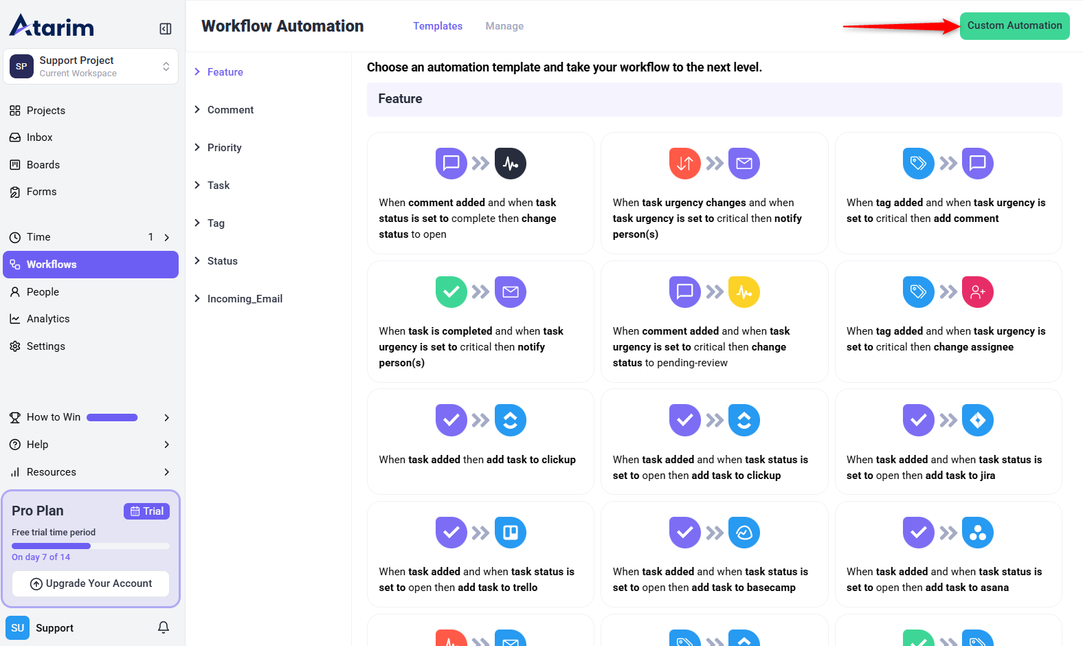 - Browse available automation templates or click the Custom Automation button to define custom workflows.