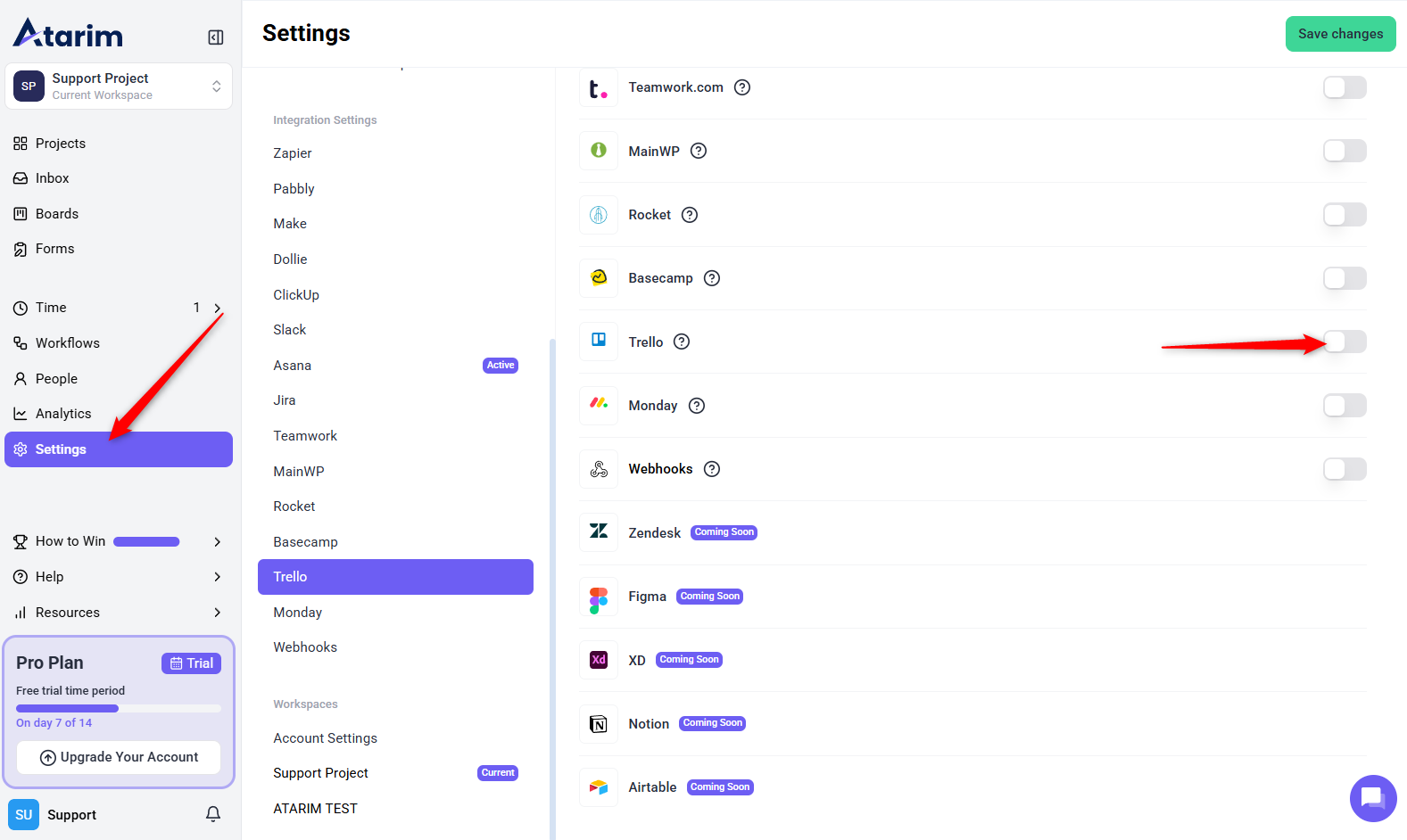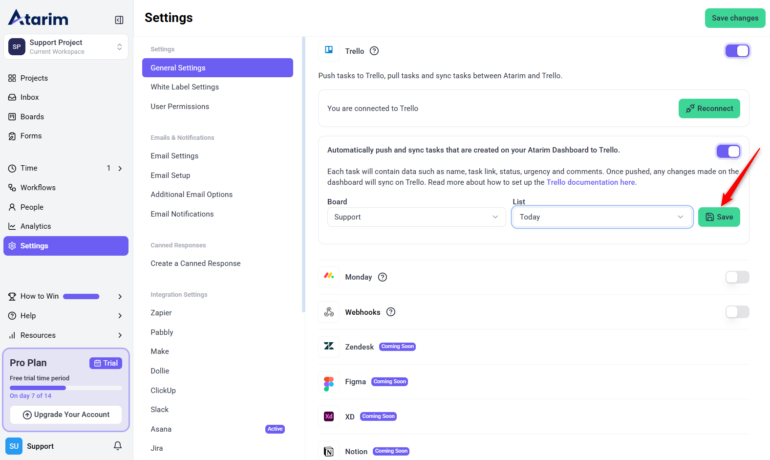 The first step is enabling Trello integration within your Atarim settings.
