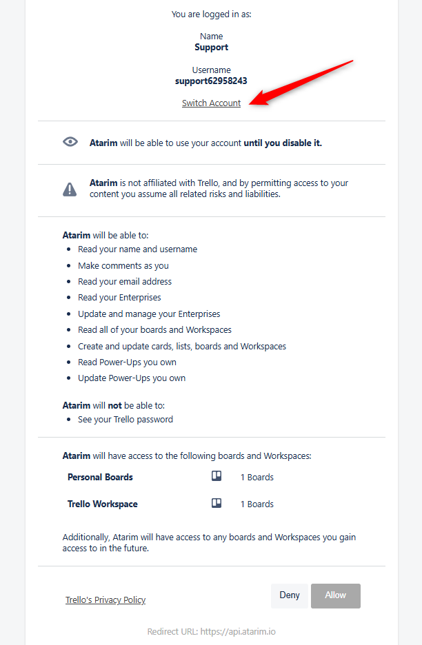 - Allow Atarim to access your Trello account by clicking Allow on the confirmation screen.
