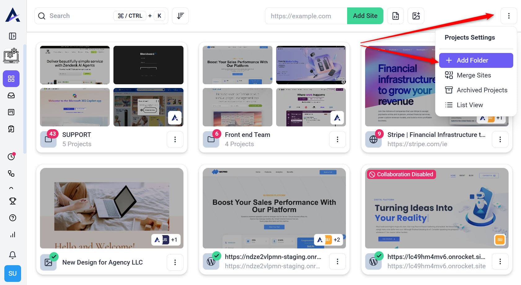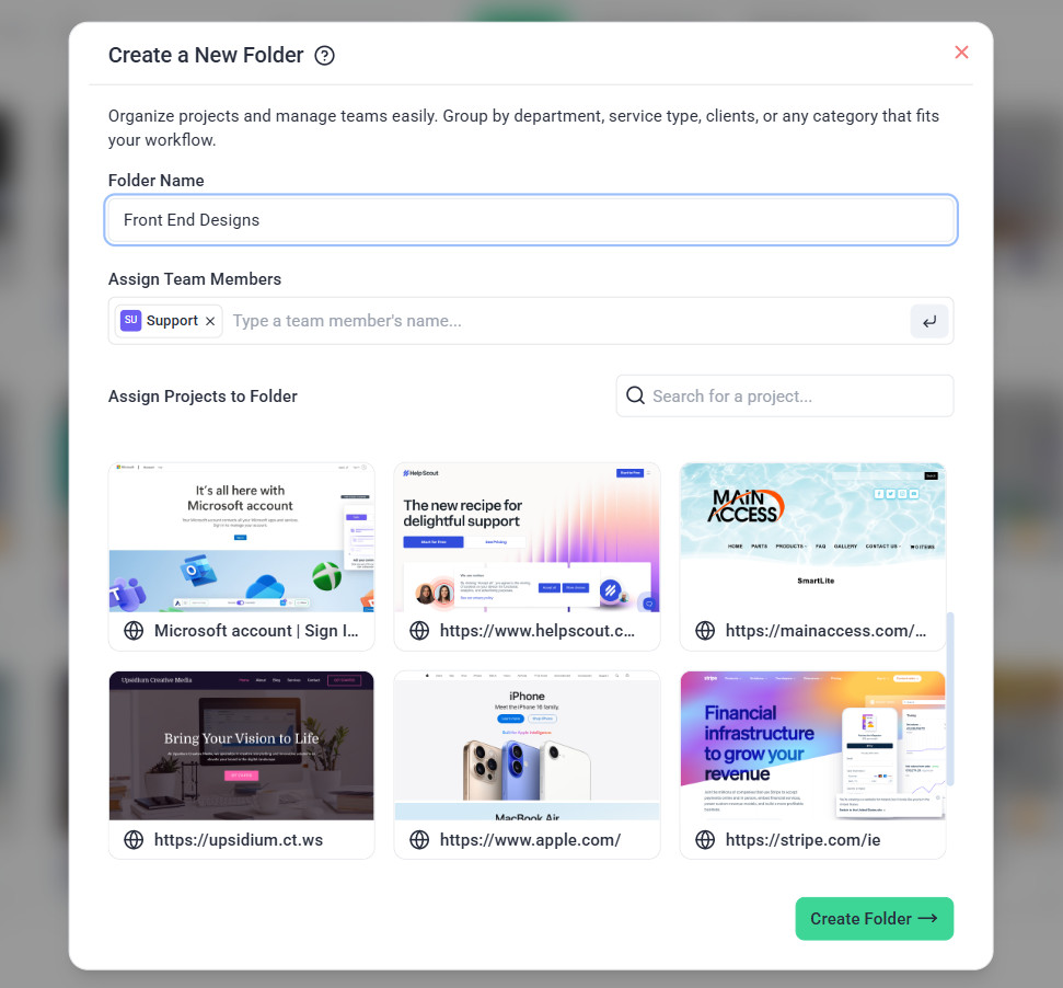 Atarim’s Folders feature offers an intuitive way to categorize and organize projects within a workspace. By grouping related projects, folders simplify project management and improve team collaboration, especially for agencies handling multiple clients or departments.