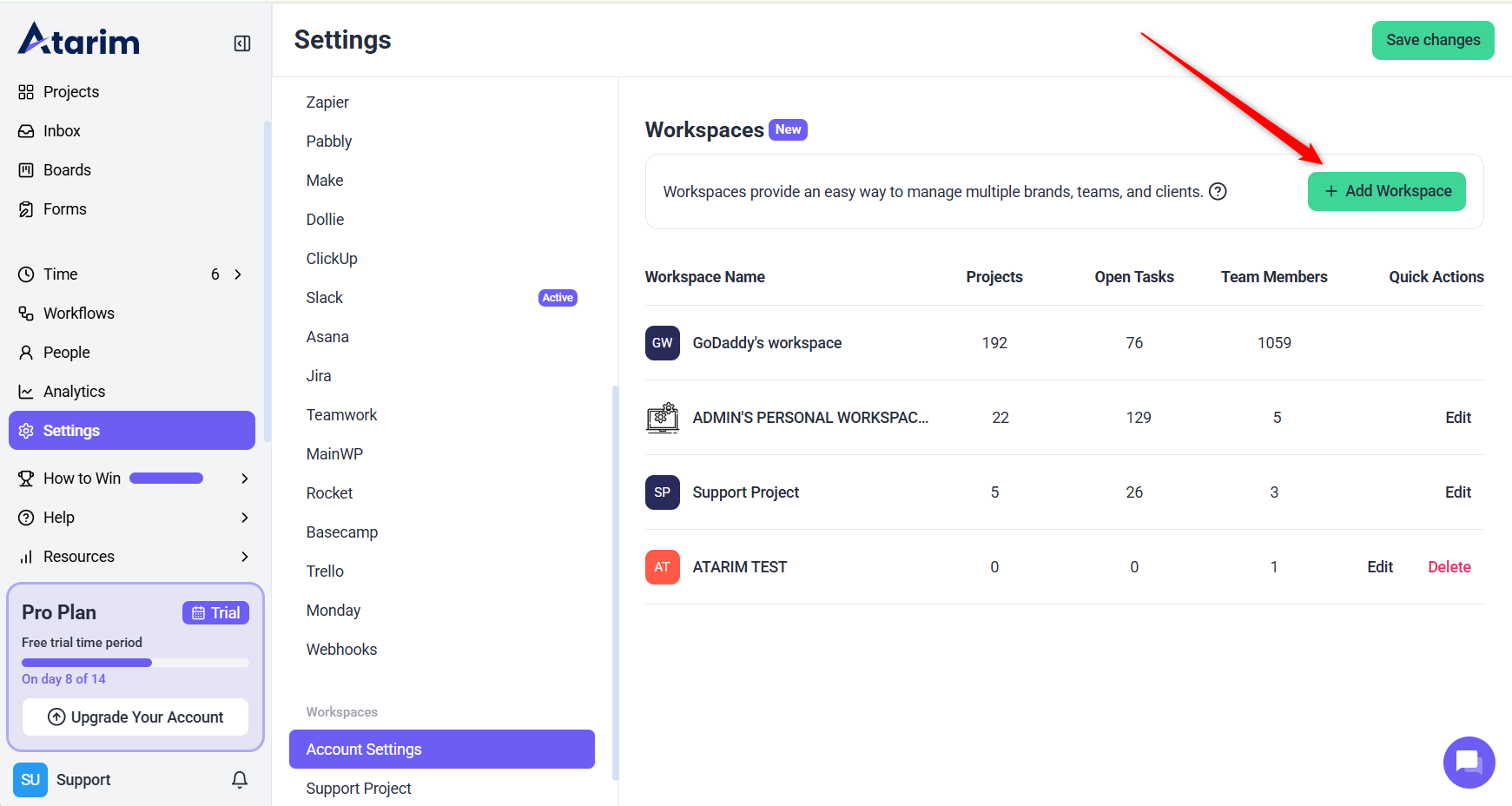 Workspaces are a powerful feature to segment projects by client, team, or department. The ability to create and manage multiple workspaces is available only on Atarim’s highest-tier plans. If you don’t see this option, consider upgrading your plan to access this feature.
