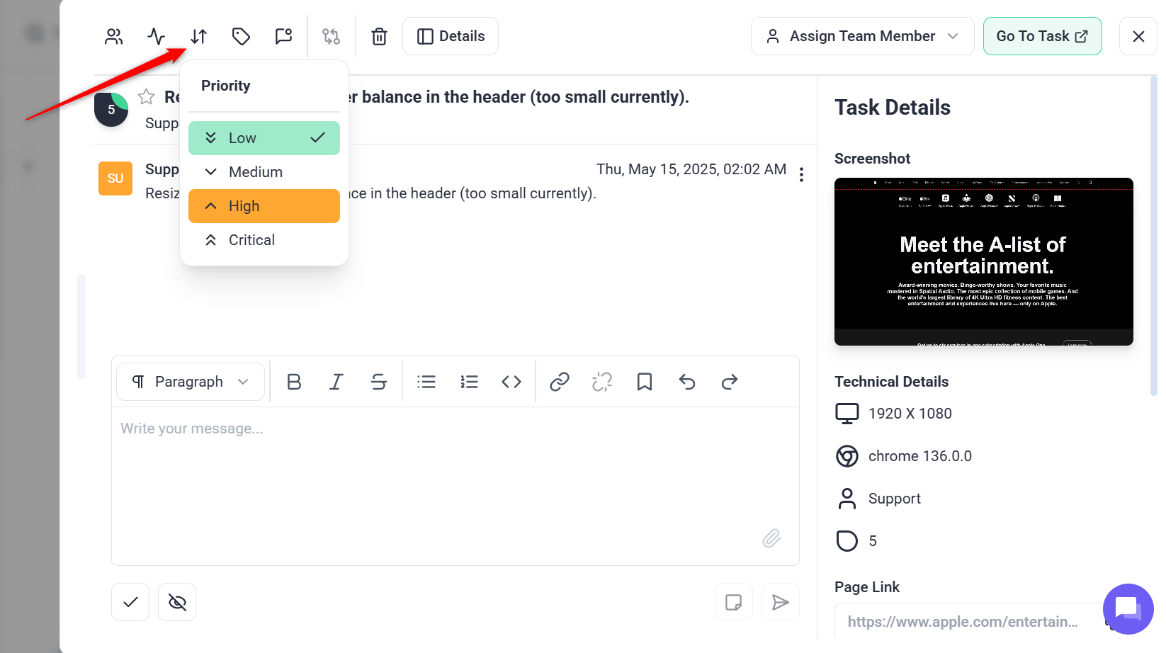 - Assign priority levels (High/Medium/Low) to tasks using the Task Management tool.