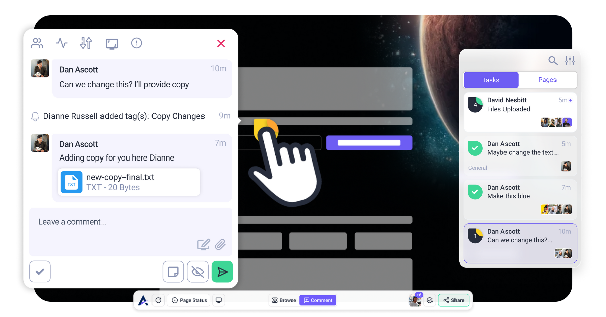 No more chasing files or guessing which version is right. With Atarim, your team works together in one place, updates happen live, and sharing is instant.